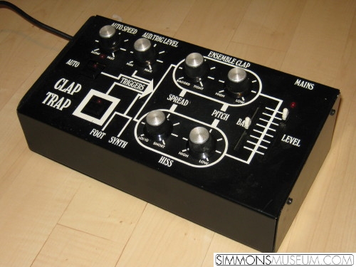 The hand is definitely the oldest percussion instrument. During the "disco" era in the seventies, the clap sound became very popular on many recordings made at that time, but thee claps where "handmade". How could bands bring this clap sound on stage? Dave Simmons detected this gap in the market and developed his first generation of clap synth: the analog Musicaid Claptrap. He went from studio to studio and demonstrated his invention. Basically this first version is a noise generator which can be roughly brought in the direction of a natural ensemble clap sound making use of a few parameters. This sound was popular for example for snare overdubs. The whole Claptrap series was probably one of the most successful product. Additionally the Claptrap sound is supposed to be one of the mostly swiped sounds ever