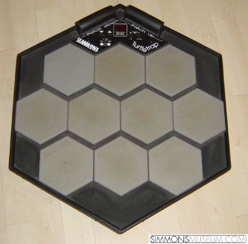 The Turtle Trap is one of the last Simmons products ever produced in series, built in 1994. It is a multi pad midi controller comprising 10 trigger zones as well as 7 jacks for external pad connection. A HiHat controller can be plugged as well. Each trigger can be assigned to a midi note and these assignments can be organized and stored in up to 60 patches. The Turtle Trap can eather be mounted on a Pearl compatible tom arm or just be used as a desktop device standing on 4 rubber feet.